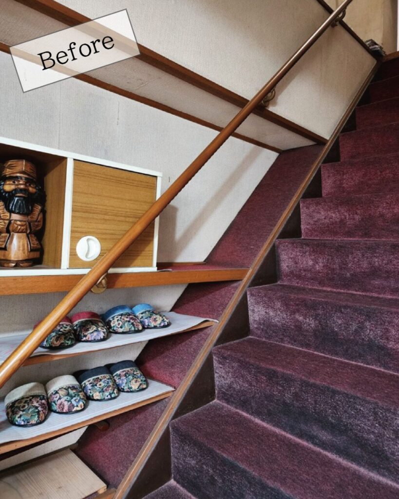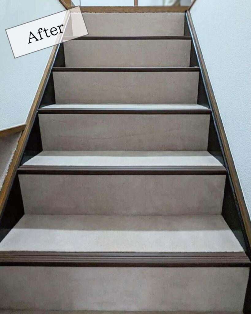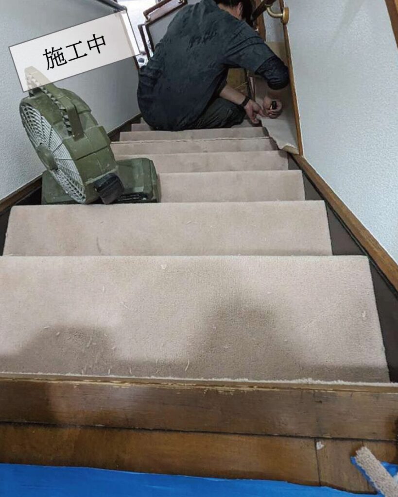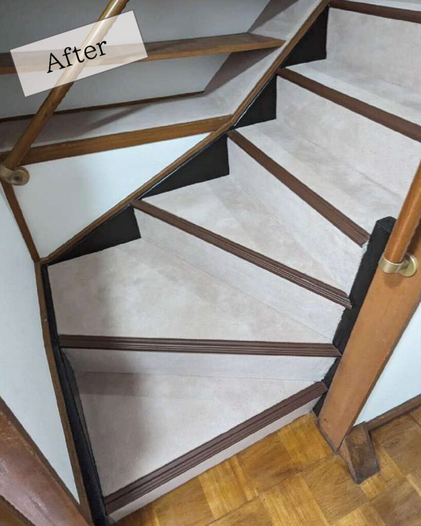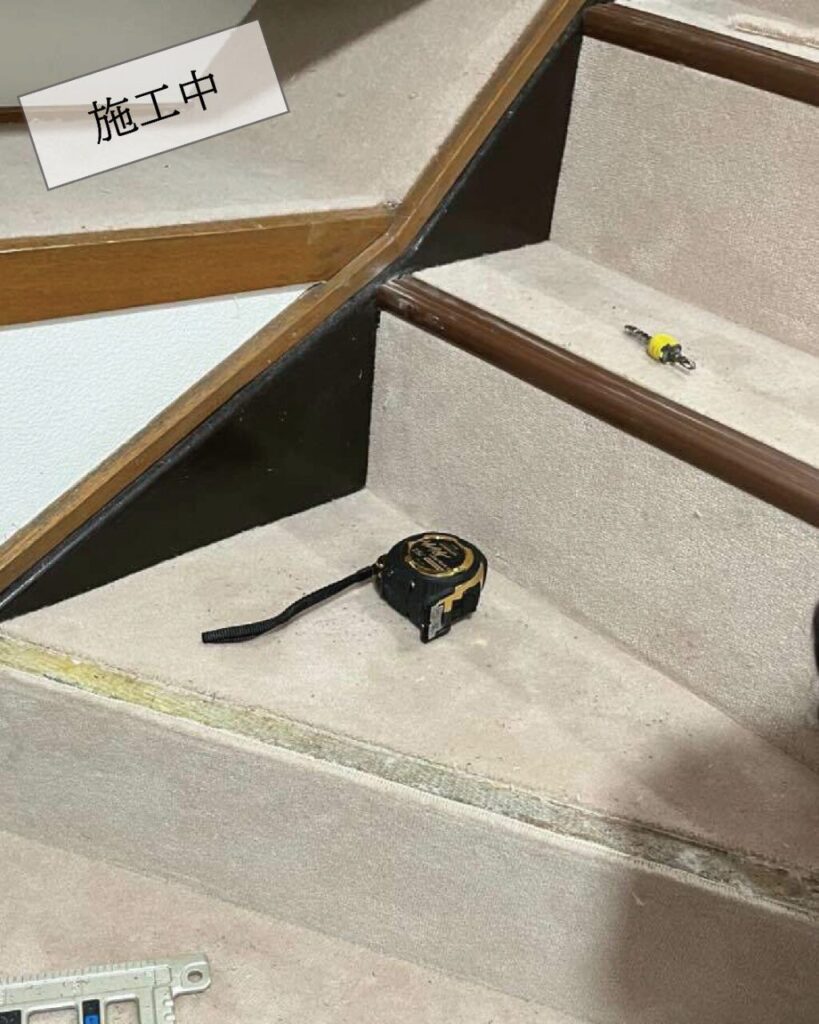 落ち着いたシックな色の階段カーペットでしたが長年のもので張り替えを行いました。